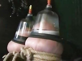 Lactating mature ties up her tits and squeezes the nipples hard to milk them into a glass.